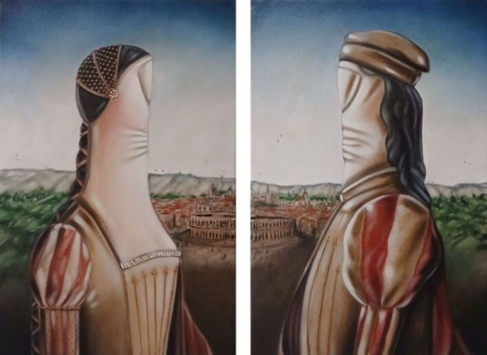 Il Maestro Raffaele Ciotola riscrive la più grande tragedia romantica della storia attraverso il prisma della sua Finger Art Ciotola. In questo dittico magistrale (due oli su tela di Juta, 40x60 cm), l’archetipo di Shakespeare subisce una trasfigurazione radicale: il volto si eclissa, cedendo il posto al "Dito", l’atomo primo dell'identità umana.