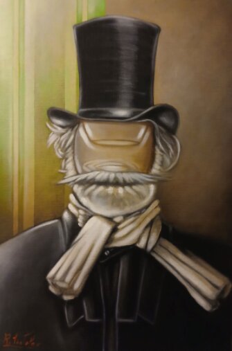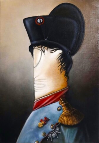 Il colletto oro e la sedia nobiliare rimandano all’eleganza classica, ma l’opera la capovolge: il dito al posto del volto infrange i canoni accademici. È un ponte audace tra reverenza per la storia e tensione verso il nuovo.
